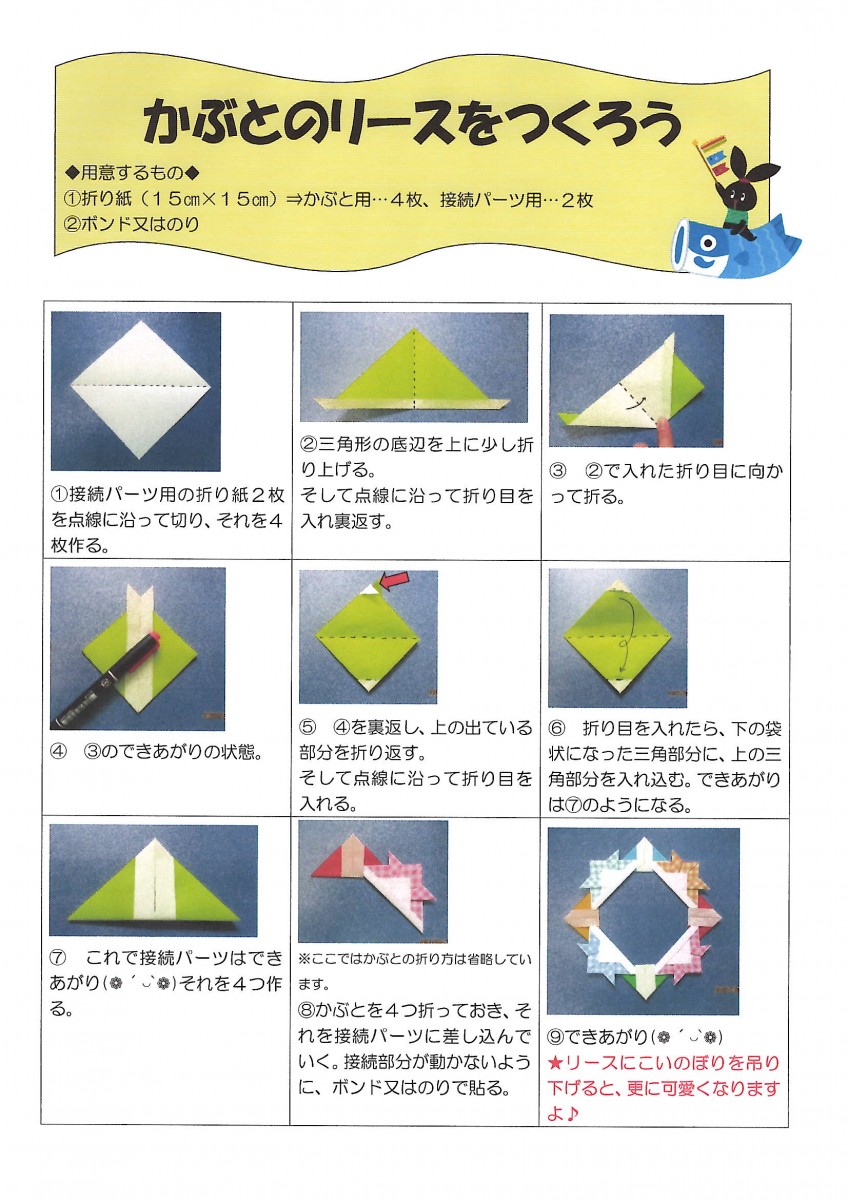 おりがみ同士はのりで貼り合わせ、持ち手を作ります。