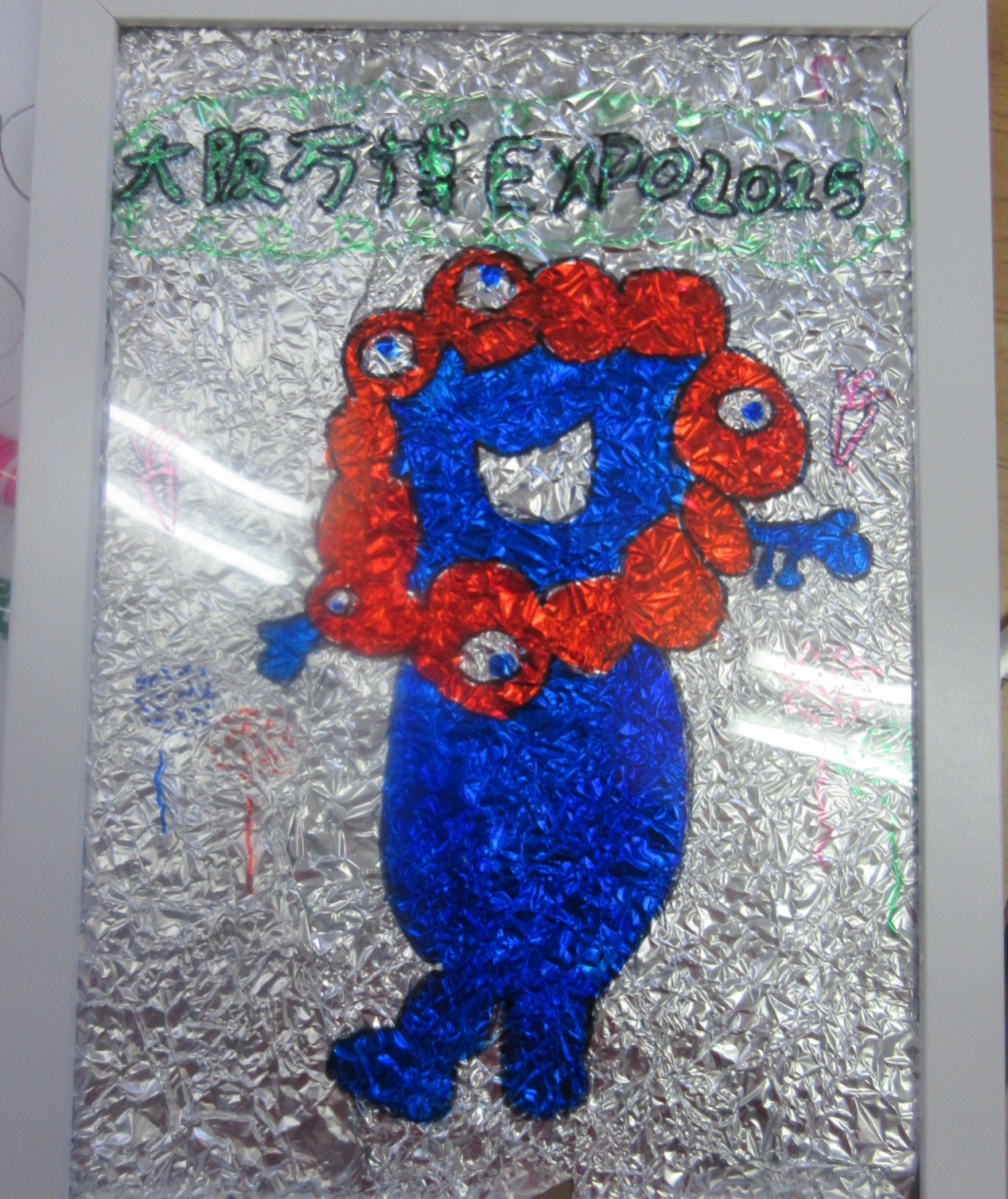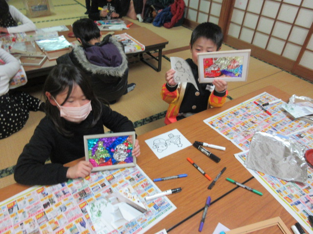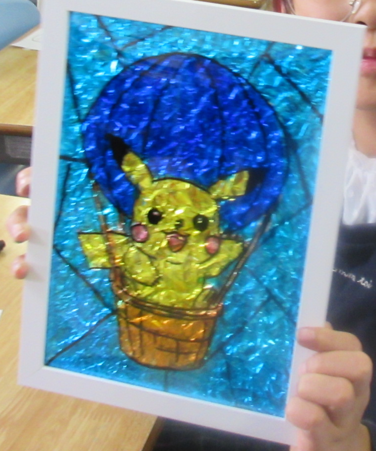 3クラス同時進行で、準備した下絵を選んだり、自分で描きたいイラストを黒の油性ペンで縁取りした後に思い思いに色付けを親子で楽しんでいる姿が見られました。アルミホイルにしわをつけ、フレームに入れてひっくり返すと「すごい!!」「きれい!!」「大きいサイズにして家でも作ってみよう♪」など親子の会話が弾んでいるのが印象的でした。