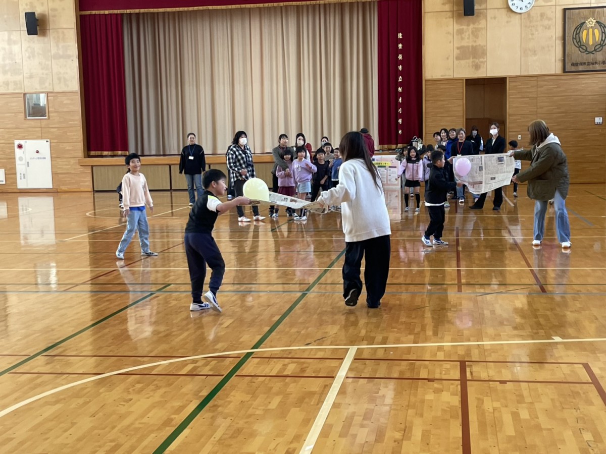 風船運びリレーでは親子でペアを組み、チーム対抗で実施しました。ふわふわと動く風船に