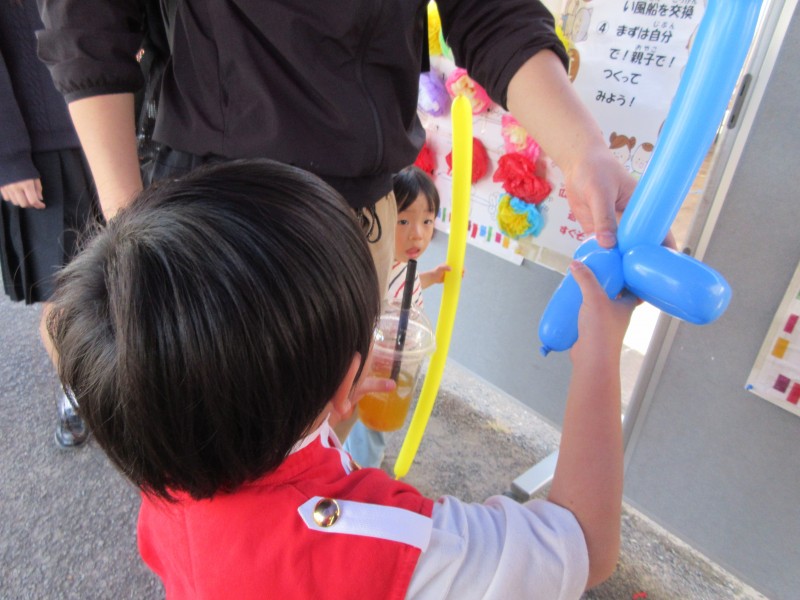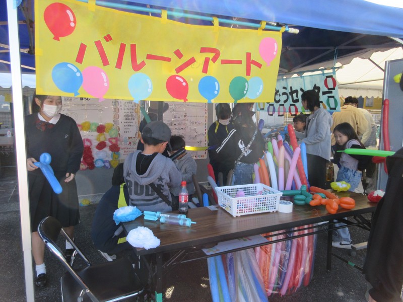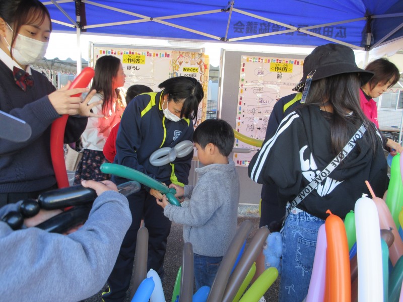 外のテントにて、東翔高校JRC部のお姉さん達に作り方を教わりながら、「犬」や「剣」を作りました。