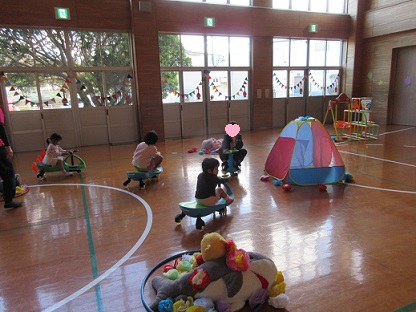 広田児童センターは29年前に建てられたので、今年で29歳です。午前中は幼児親子さんが楽しく遊べるように、遊具をたくさん出しています。