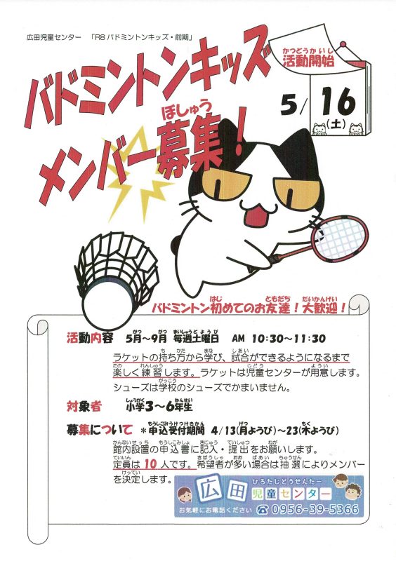 令和8年度のバドミントンキッズは、4/13~申込開始です。詳しくはセンターだよりや館内ポスターをみて下さいね。