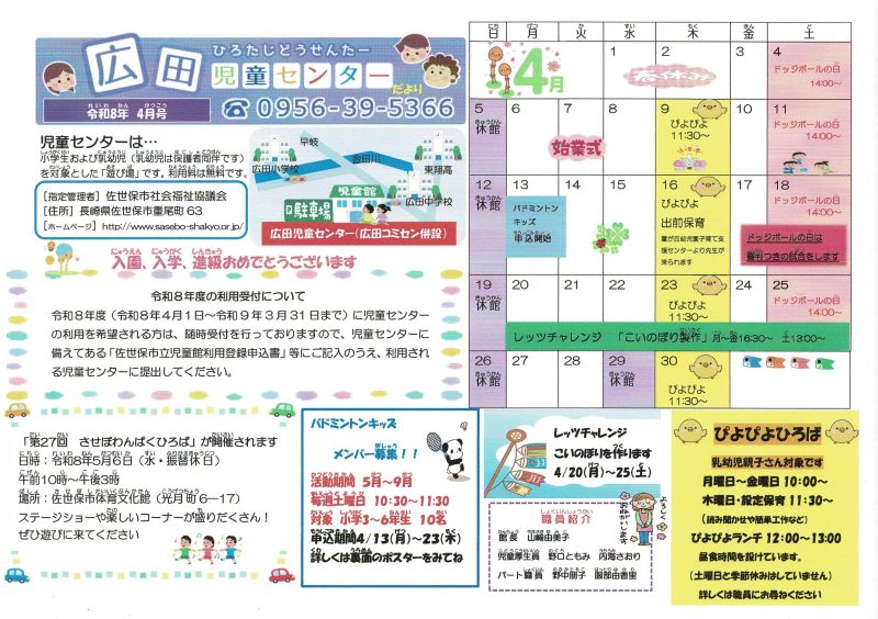 4月のおたよりはこちらをクリック→→広田児童センターだより 4月号