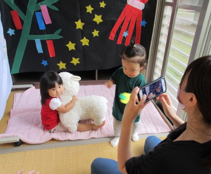 こちらは、七夕バージョンのフォトブースです。織姫と彦星のツーショットチャンスなのに、アルパカを抱きしめるAちゃんと止まってくれないSちゃんが、かわいくてたまりません❤❤❤
