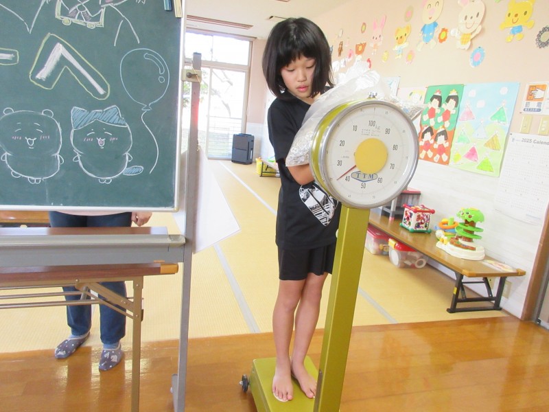 Aちゃんの体重をはかり、次はプルタブを持ってもらい、出た数字を引き算しますよ。