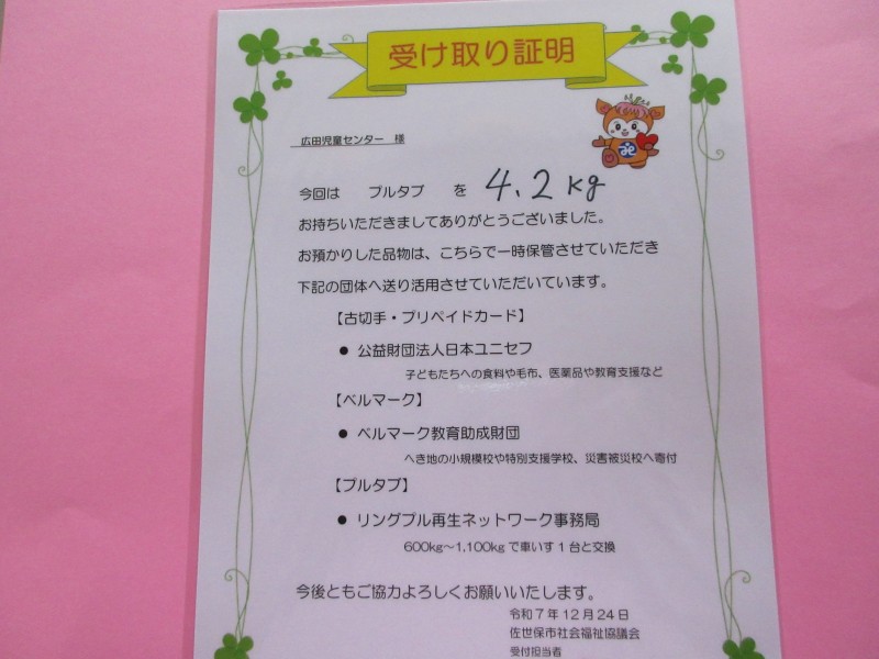 後日、佐世保市社会福祉協議会に搬入し、受け取り証明書をいただきました。