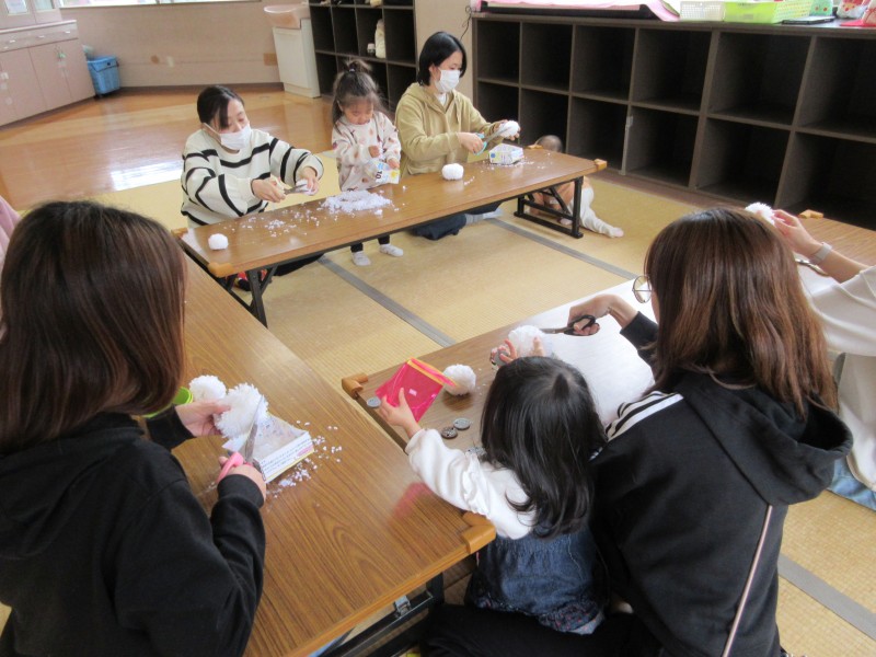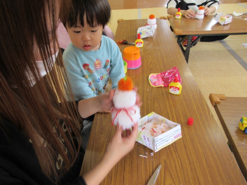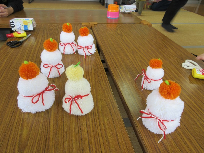 <ぴよぴよスペシャル②>いつも幼児さんの工作をやさしく見守るお母さんですが、今回はママが主役で鏡もちをハンドメイドしました♪真っ白な毛糸のボンボンが、みるみるうちに素敵な鏡もちになりました。素敵なお正月になったことでしょうね❤