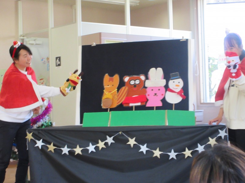 ミュージカル風に音楽が流れて、サンタクロースが動物さんたちにプレゼントを配ります。みんなでサンタさんを元気に応援しました❤