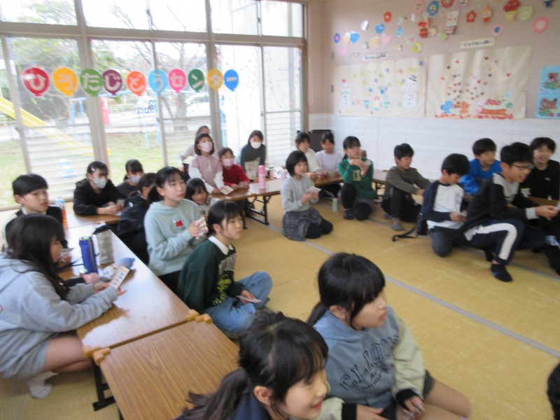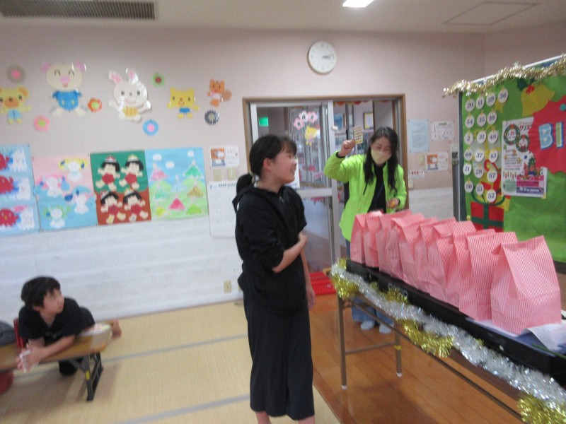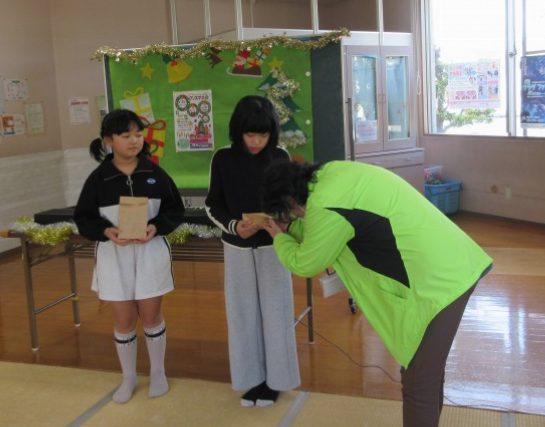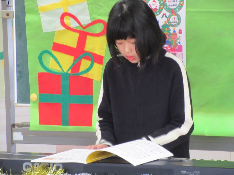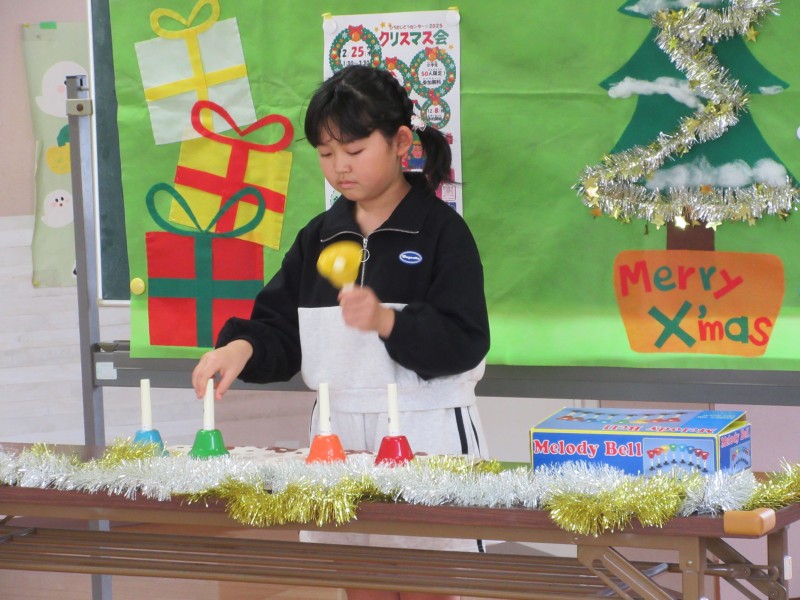 3年生Kさんと5年生Aさんによるハンドベルとピアノの演奏でクリスマス会スタートです(^^♪とっても上手に演奏してくれた2人に大きな拍手とチョコっとしたお礼が贈られました。