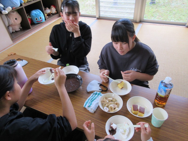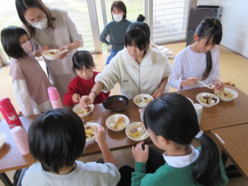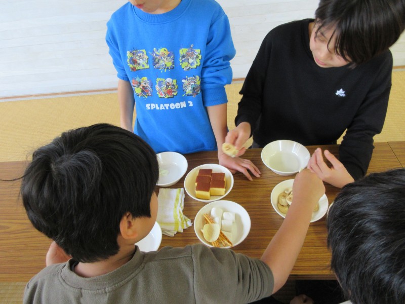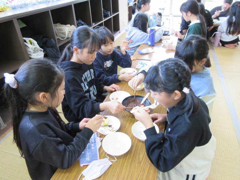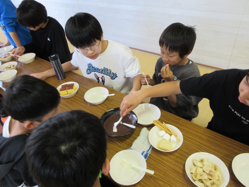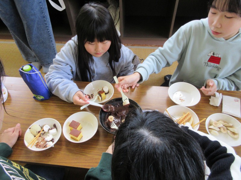 いよいよお待ちかね!チョコレートフォンデュの時間です♪用意した具材にチョコをたっぷりつけていただきま~す!バナナが一番おいしいぞ!カステラ2個食べたー!先生!イチゴください!とみんなでおしゃべりしながら楽しくパーティーしました♪