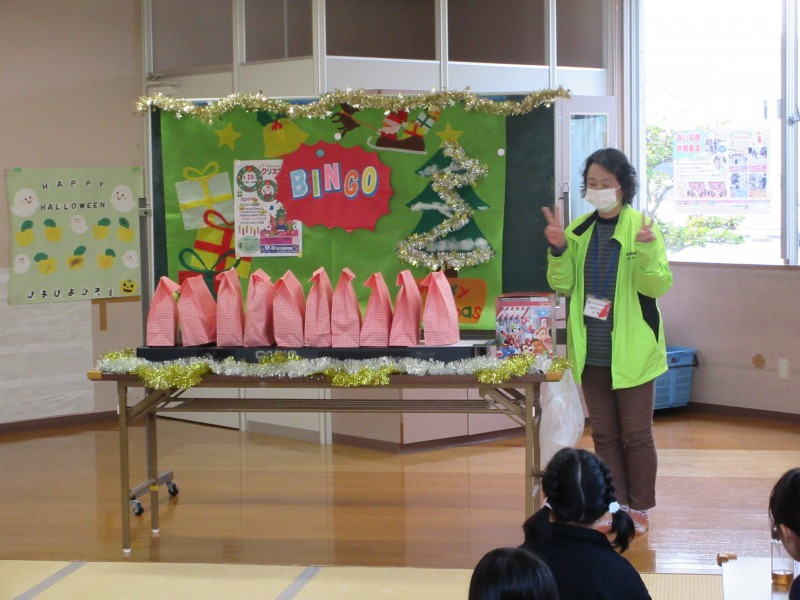これが一番盛り上がった!ビンゴ大会!みんなの運命をつかさどるのは我らの女神☆広田児童センター館長先生です!リーチがどんどん増えるとみんな希望の数字を大声で叫びました。