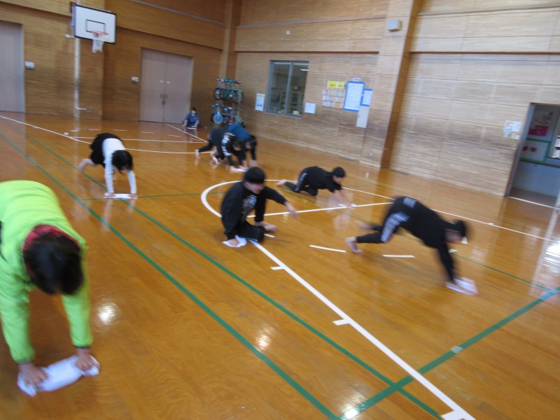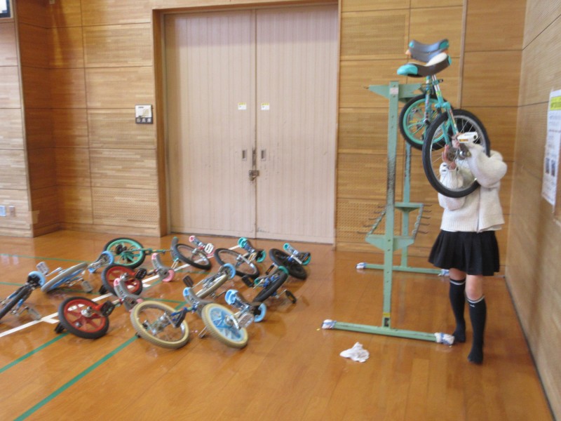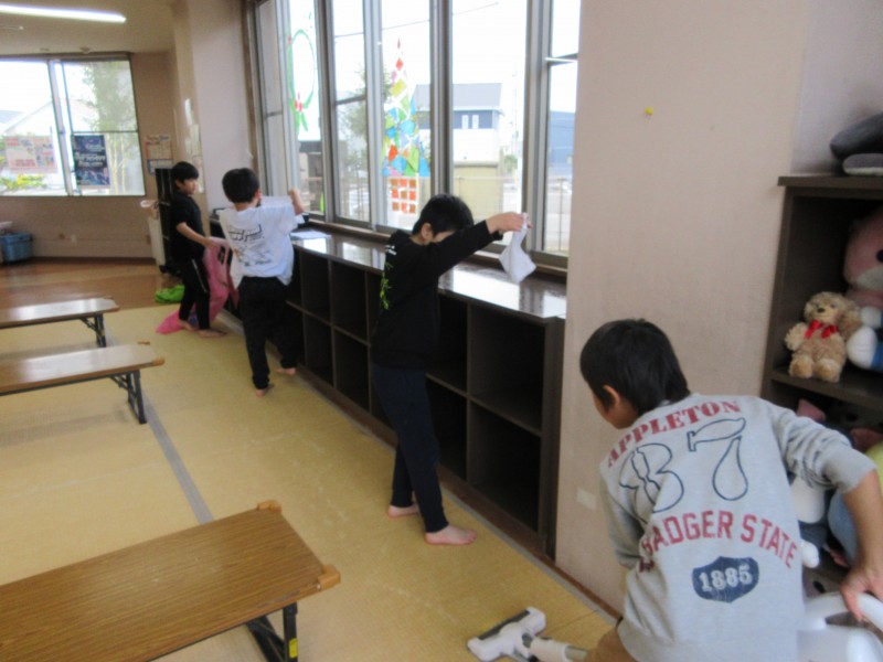 体育室はみんなで乾拭き競争だ!途中から、足腰に自信のある現役ママさんバレーの職員も参戦!それならばと、靴下を脱いで参戦するお友達もでるほど盛り上がりました 😀 もちろん窓拭きも一輪車整理もばっちりです✨