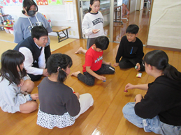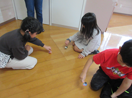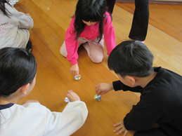 「長ーく、コマを回せた人が優勝ですよ。」「優勝した人にはいいことあるかも。」と声をかけると更にまわす練習を重ねて、コツをマスターしたところで、いざ勝負!!