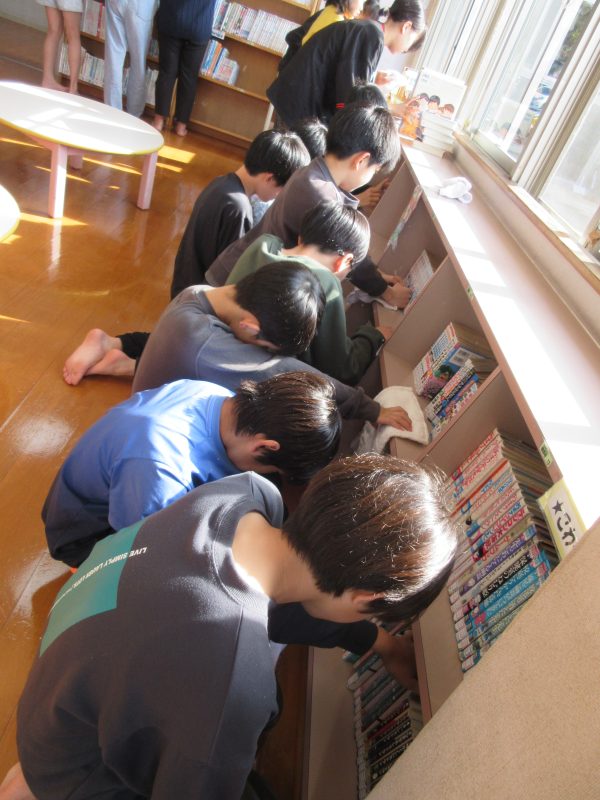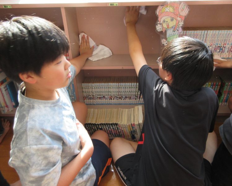 2日目は図書室。本棚の拭き掃除をしたり本を順番通りに並べたりしていくうちに、こんな本あったっけ?とあらためて発見する様子も見られ、これを機会にもっと本に興味を持ってほしいです。