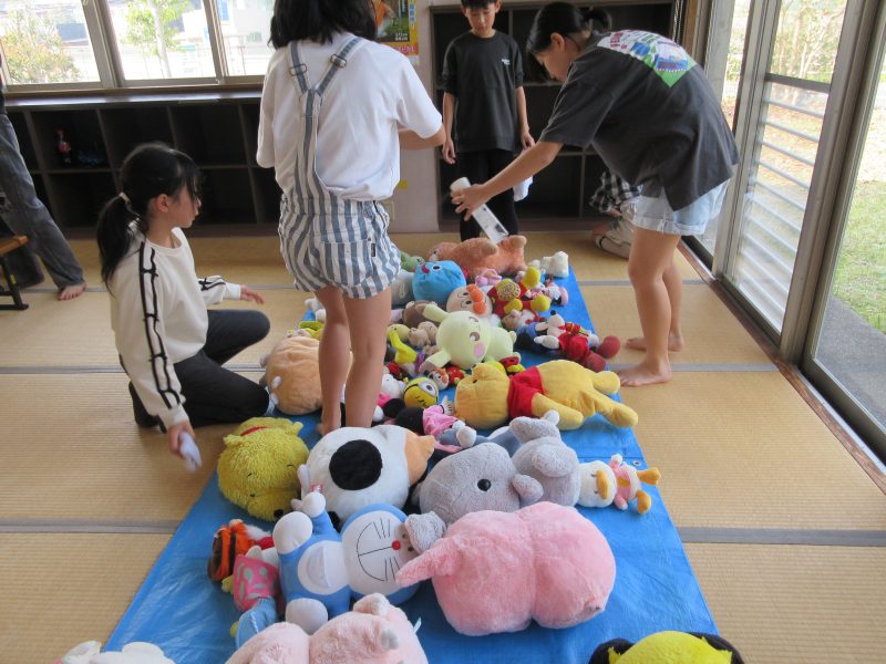 3日目は育成室。タオルと水筒などを置く棚と机の水拭き、それからぬいぐるみの整理をしました。利用者さんやご近所さんからいただいた50個のぬいぐるみは、仲良く並んで日光浴しました🌞