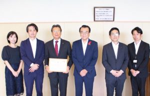 ▸登録証を手に記念撮影(特別養護老人ホームチューリップ 永田理事長(写真左から3番目)、佐世保市社会福祉協議会 深江会長(写真左から4番目))