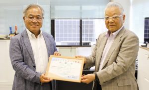 ▸登録証を手に記念撮影(むすび会 吉木理事長(写真左側)、佐世保市社会福祉協議会 岡﨑副会長(写真右側))
