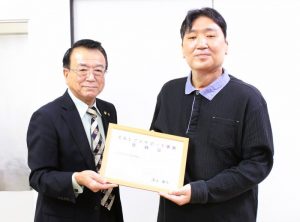 ▸登録証を手に記念撮影(佐世保市社会福祉協議会 深江会長(写真左側)、佐世保市視覚障害者協会 古川会長(写真右側))