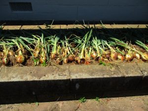 収穫した玉ねぎは3個ずつほどしっかりと結んで干します。