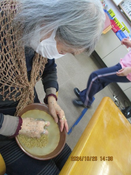 まずビンの蓋を使って脱穀します。これは簡単にできみなさん楽しそうでした。