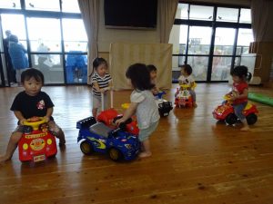 1歳児は遊びが活発になり、洗濯ごっこを楽しんだり、車に乗って遊んでます!