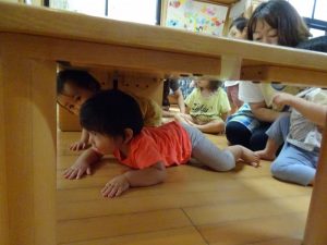 「地震です・・」の声に、机の下に避難して・・・