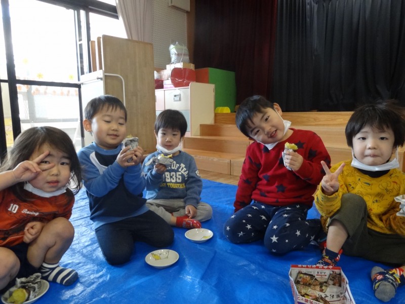 雨天のため、室内にて焼けたホッカホカの芋をみんなで食べました~