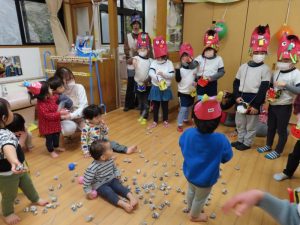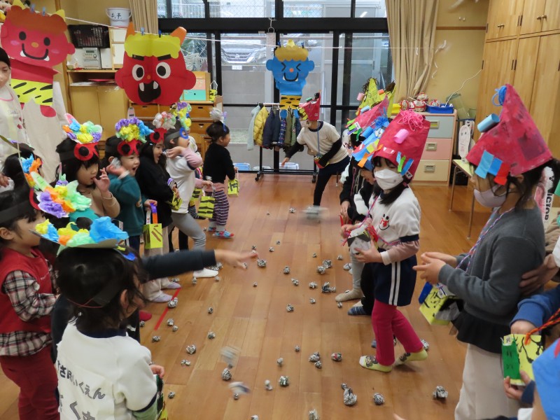 そして、さくら組が各クラスを回り、一緒に豆まきをしました。