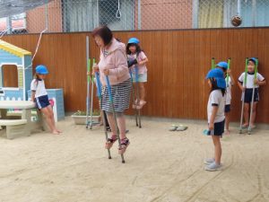 年長児はバランスをとるのが難しく何度もくりかえし挑戦中です。