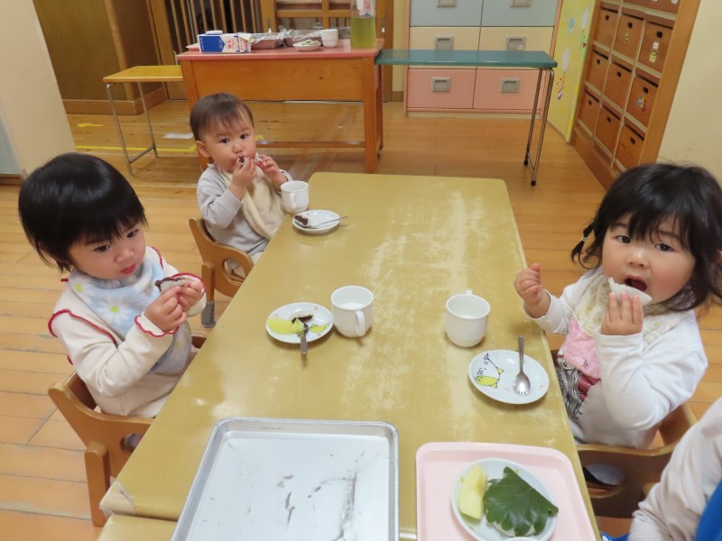 こどもの日にちなんでおやつはかしわもちでした。