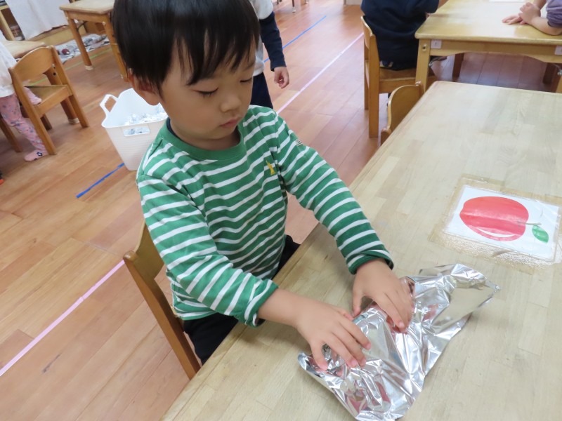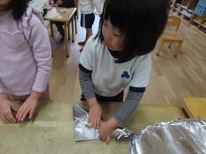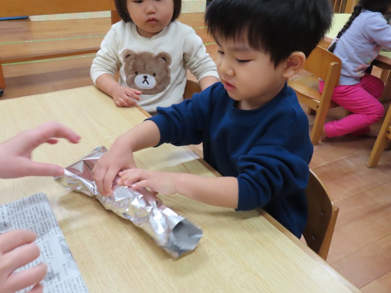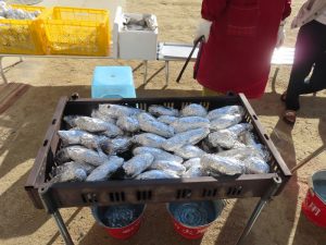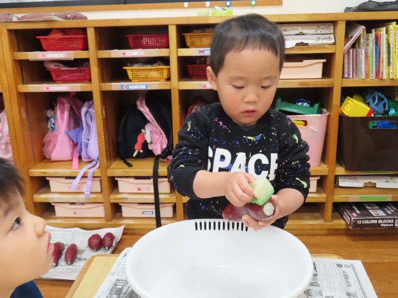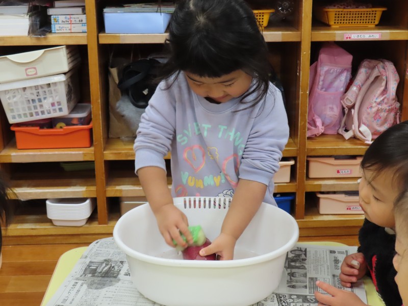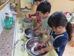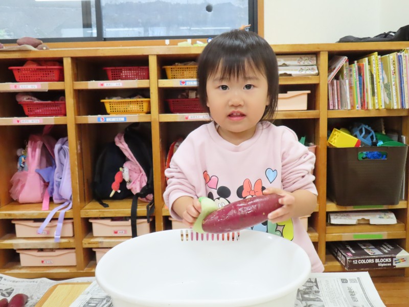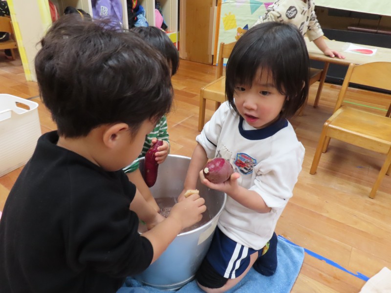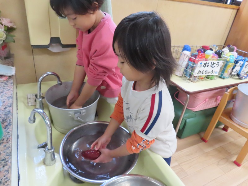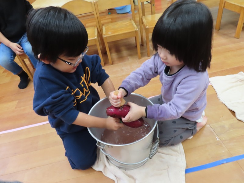 前日にみんなでお芋を洗ったり、包んだり…。楽しみ~♪