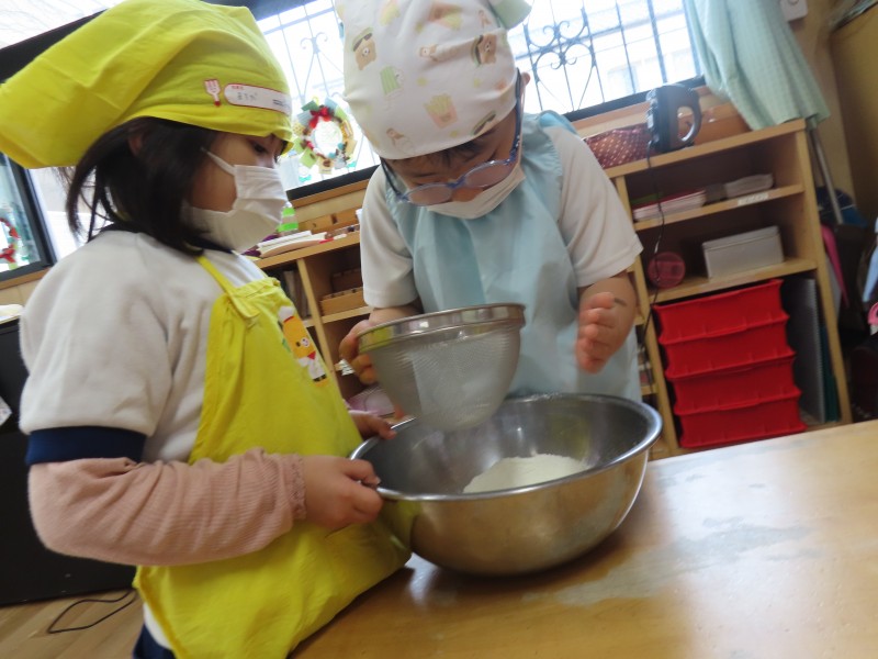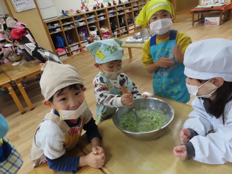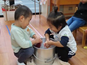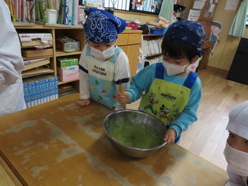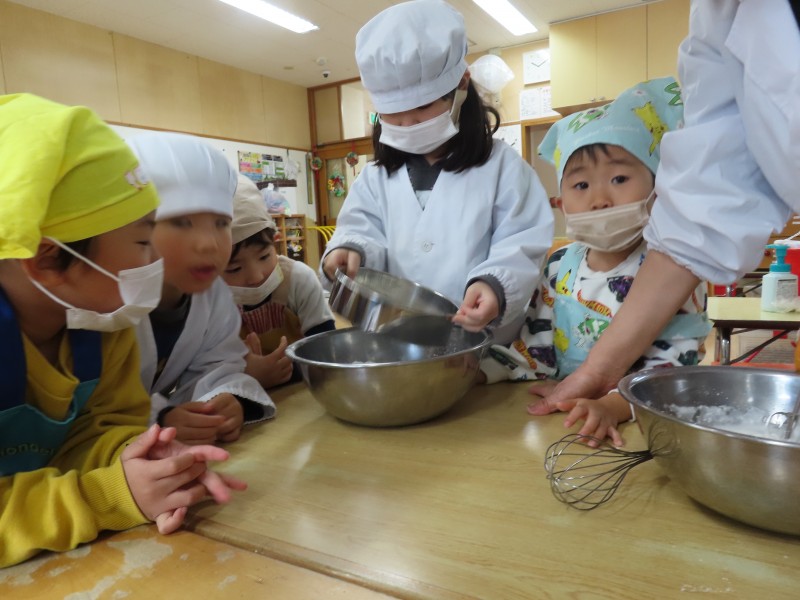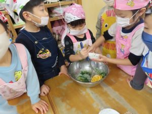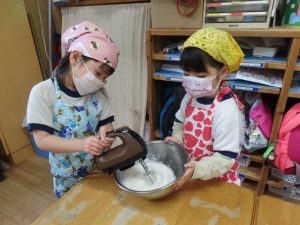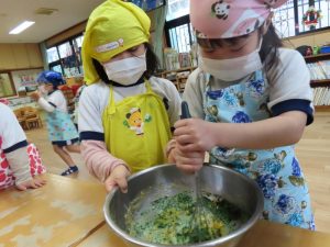 年長さんがリードしながらボウルを押さえたり、混ぜたり…。