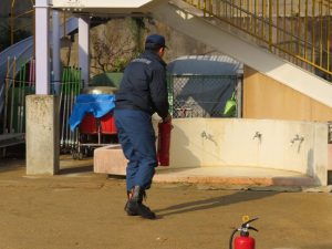 水消火器の消火訓練は、子どもたちが応援してくれました。