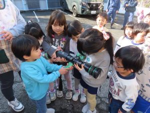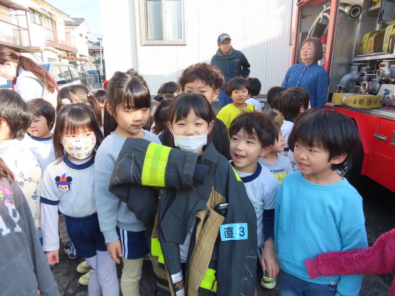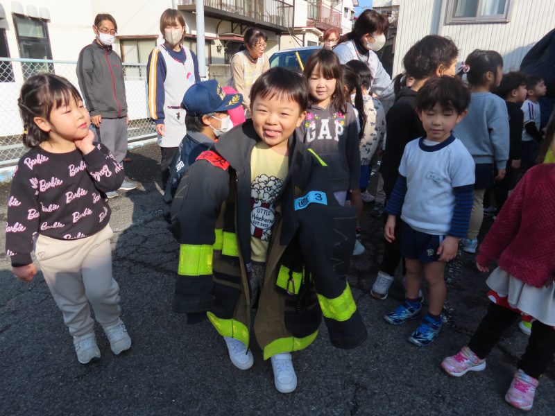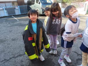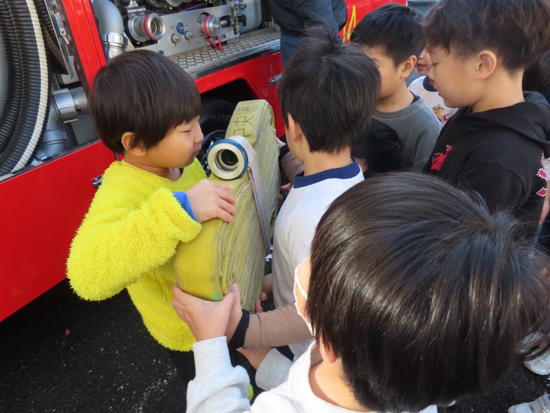 重いホースを持ってみたり、消防服を着せてもらったり…。
