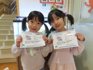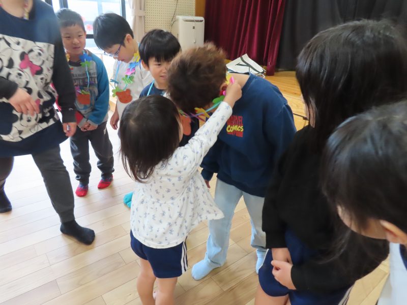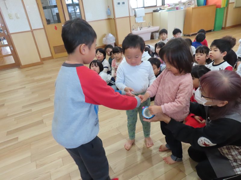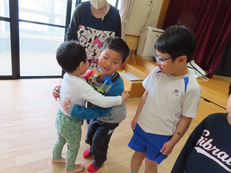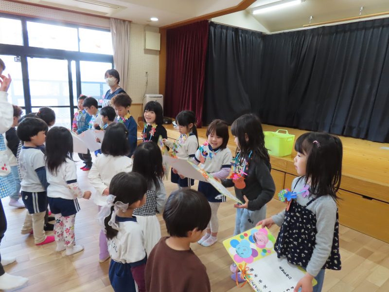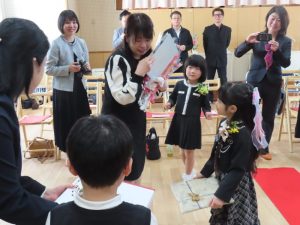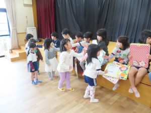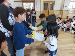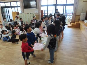 みんなからもプレゼントを渡しました。「しょうがっこうでもげんきにがんばってください」