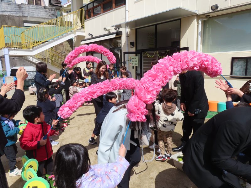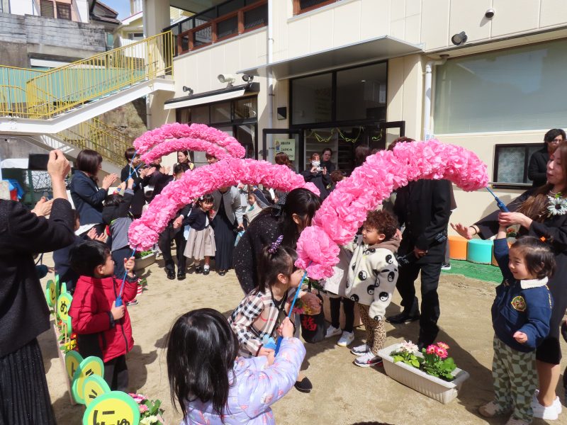 在園児さんがお花のアーチでお見送りしてくれました。