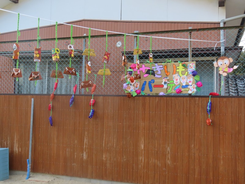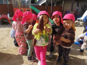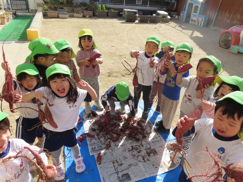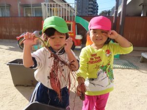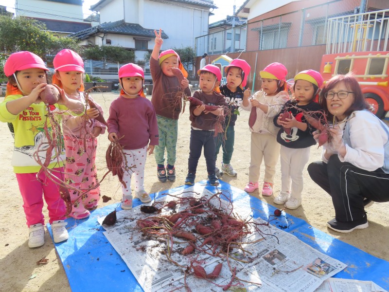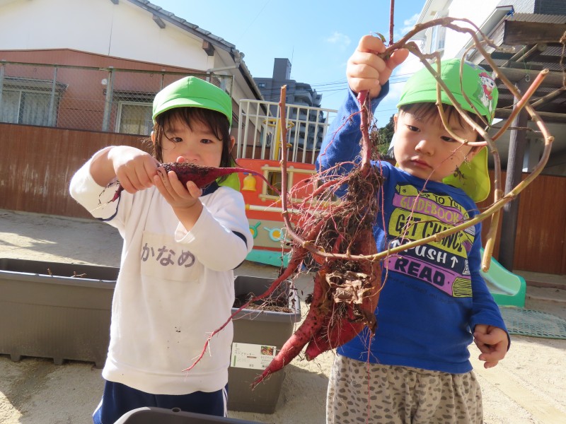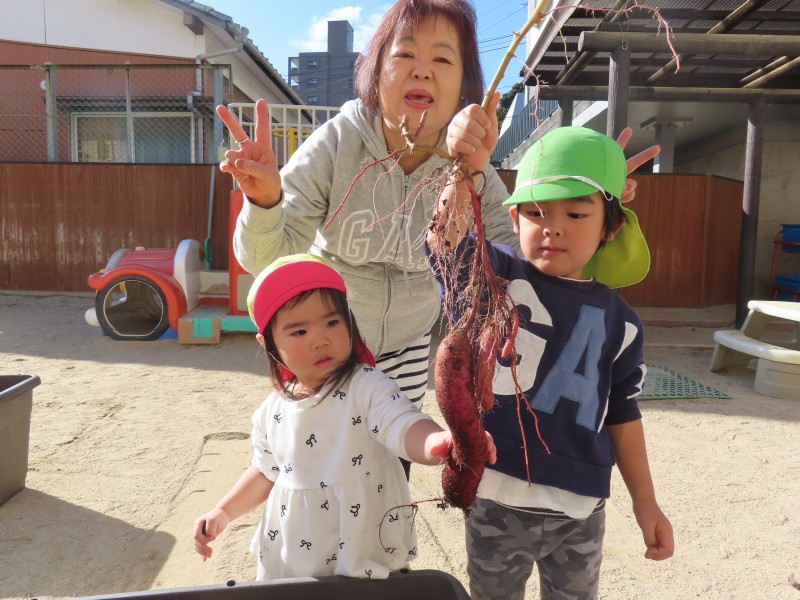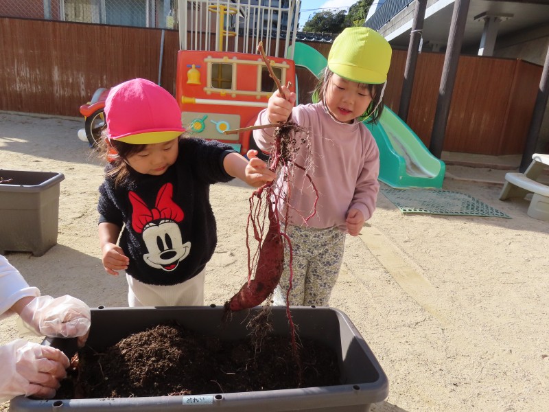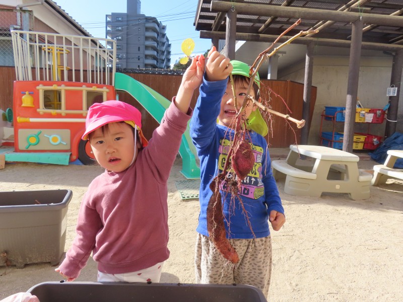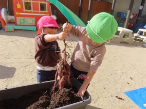園庭のプランターで育てたお芋を2・3歳児さんが収穫しました。