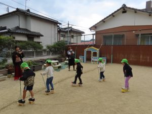 もう一つのゲームは風船がついたひもを引っ張りながら1周させます。