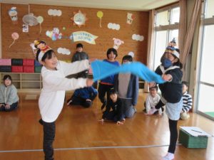 ひなあられに見立てたお手玉をタオルに乗せて、『ひなまつり!』のかけ声で的を
