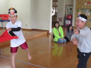 めがけて放ります。的に入ったお手玉の数が得点になり、競い合いました♪