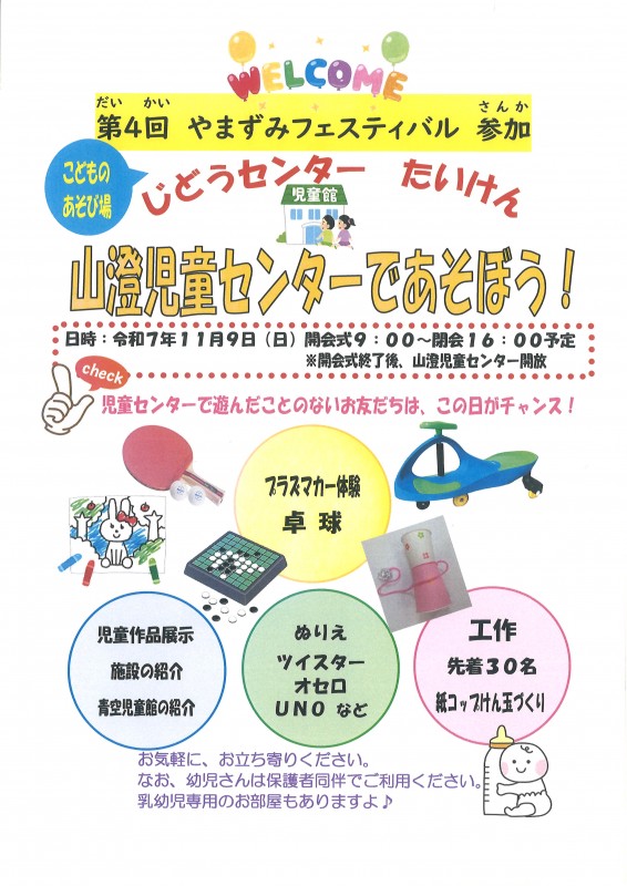 11月9日(日)やまずみフェスティバルが予定されており、当館も施設開放をします。