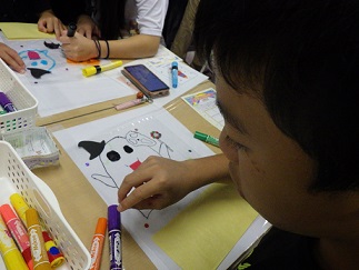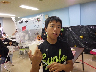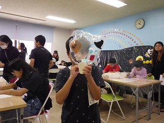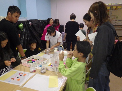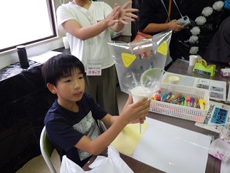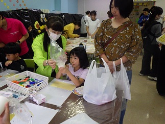 ビニール袋に自由に絵をかくか、好きな動物やおばけのパーツを貼るかを受付で決めます。
