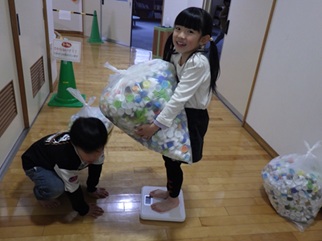 こどもたちや地域の方々に、ご持参いただいたキャップの重さを量りました。