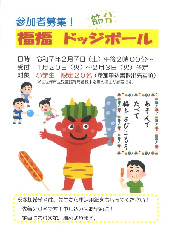 1年間、みんなが健康で幸せに過ごせることを願って、当館では、節分イベント「福福ドッジボール」を予定しています。