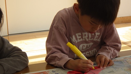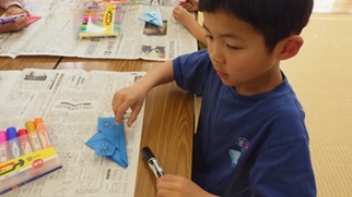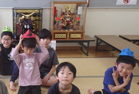 立派な五月人形、兜のまわりに、お友だちがつくった兜を飾りました!