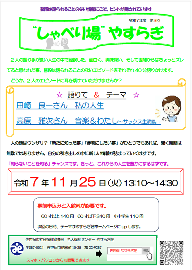 しゃべり場“やすらぎ” 第3回を11/25(火)に開催します