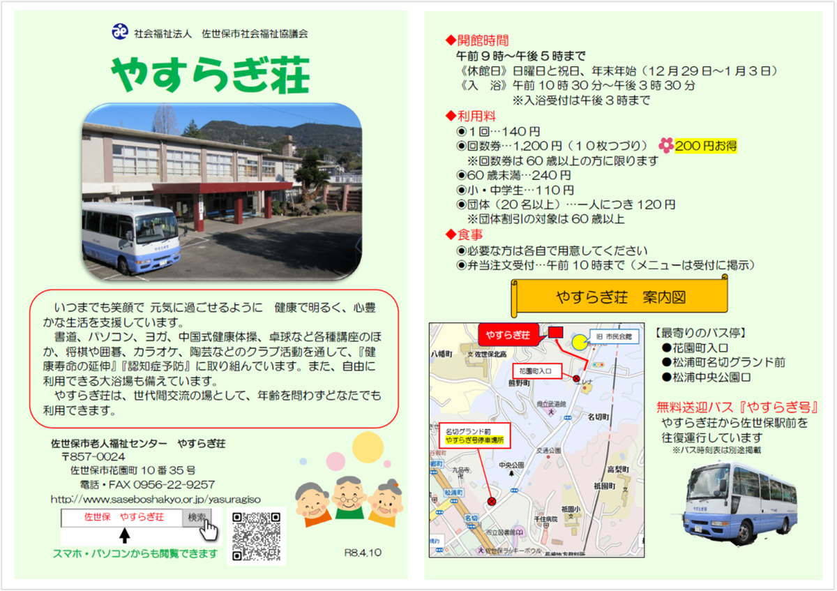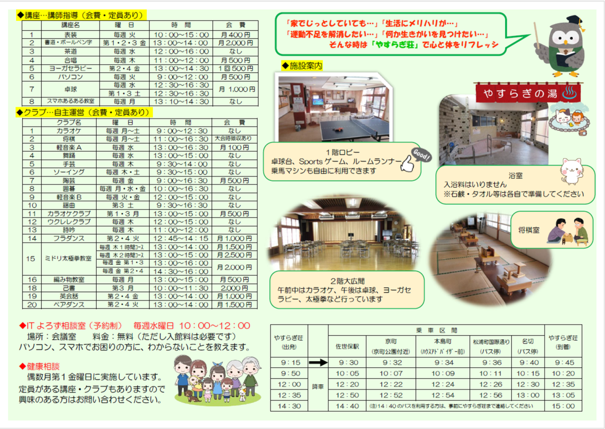 ●送迎バス『やすらぎ号』を無料運行しています。●どなたでもご利用できます。