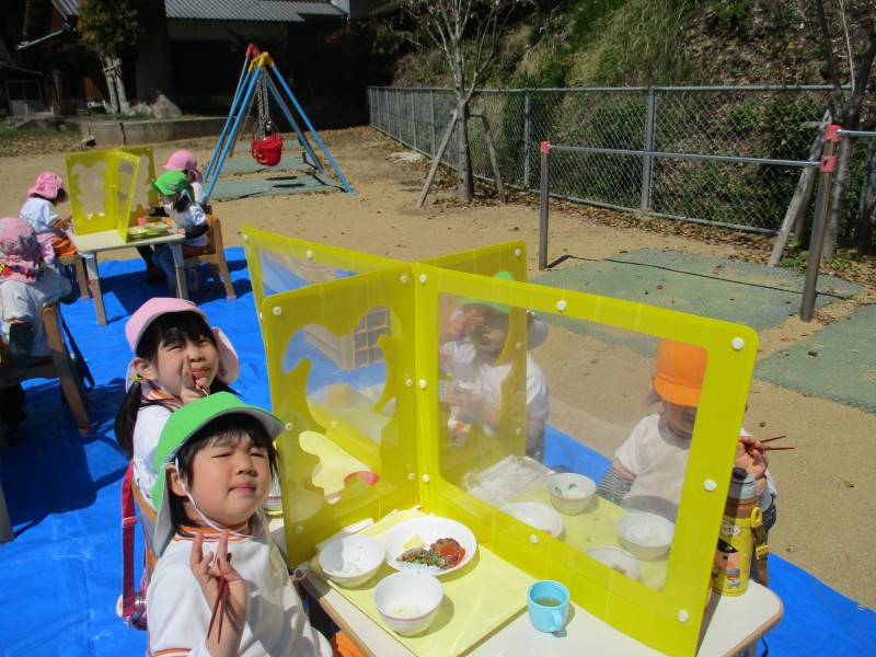 大きいクラスの子はお花見をしながら給食を食べました。外で食べる給食はとても美味しかったようで、おかわりもたっぷりして大満足、「気持ちよかったね~」「また、みんなで食べたいね」と友だちと会話を交わし、楽しいお花見になったようでした。