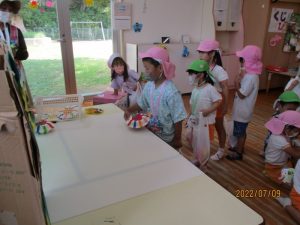 今年は園児のみで夏祭りをしました。『ジャングル』をテーマに、園庭やテラスに、0歳児から5歳児まで自分たちで作った色とりどりの動物たちが並びました。