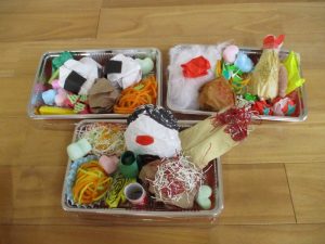 5歳児は廃材を使って、親子でお弁当製作をしました。タオルやプチプチ、キッチンペーパーなどをおにぎりにしたり、包装紙や紙袋を唐揚げやエビフライに見立てるなど、アイディアいっぱいのお弁当が出来上がりました。また、何のお弁当を作ったのか、みんなの前で発表し、どのお弁当も美味しそうで、見ているだけでおなかいっぱいになりました~